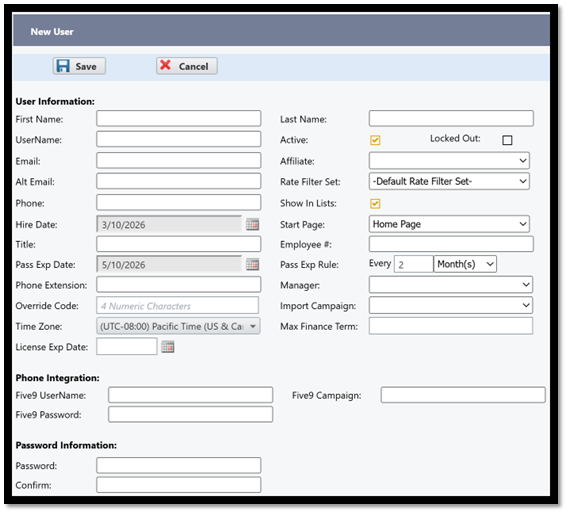e. This will direct you to a dialog box where you will enter the new User’s information. Once complete, click the Save icon