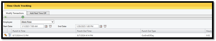 1. Time Clock Tracking- This report allows you to select a specific user and date range to view all Time Clock entries. You can edit time clock transactions, add or remove entries, or enter Paid Time Off.