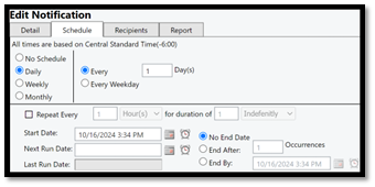 a. Set the desired date and time for your Notification to process. You can run daily,