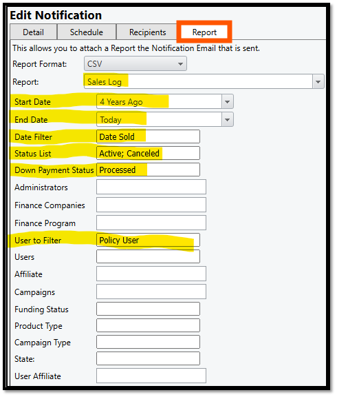 1. 4. Report Tab-This is where you attach a report to your notificationSelect the same fields here as if you
