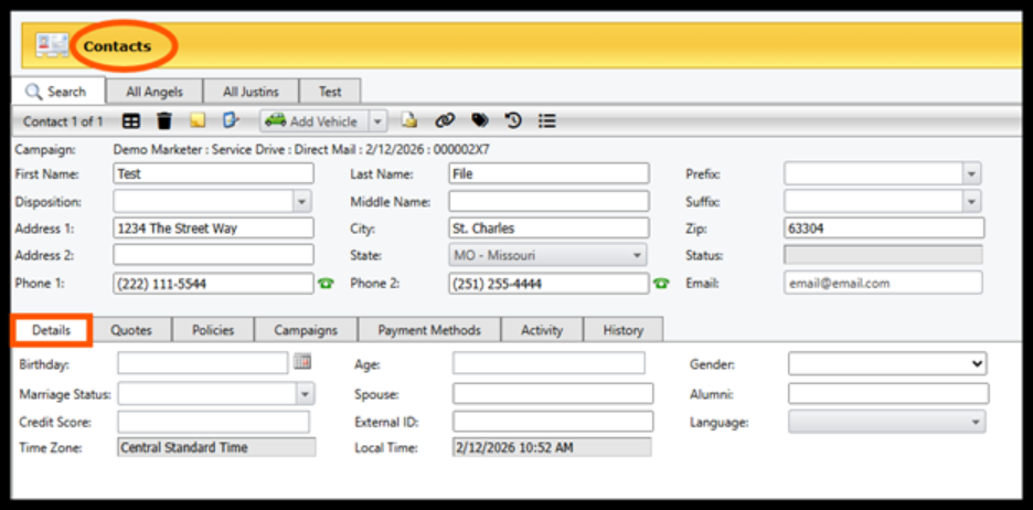 7. Now that a Contact has been created, an asset can be added (Vehicle, Home, RV, etc.) to this